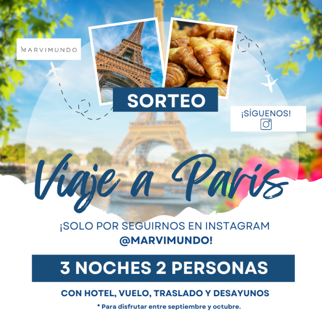 Gana un viaje de 3 noches y 4 días en París para dos personas en un hotel de 4*+ desayuno (tasas excluidas) que sorteamos solo por ser seguidor de nuestra cuenta de Instagram @marvimundo. ORGANIZADOR DEL SORTEO La organización del presente sorteo se ha llevado a cabo por Marvimundo S.L.U, con domicilio en C/ San…
